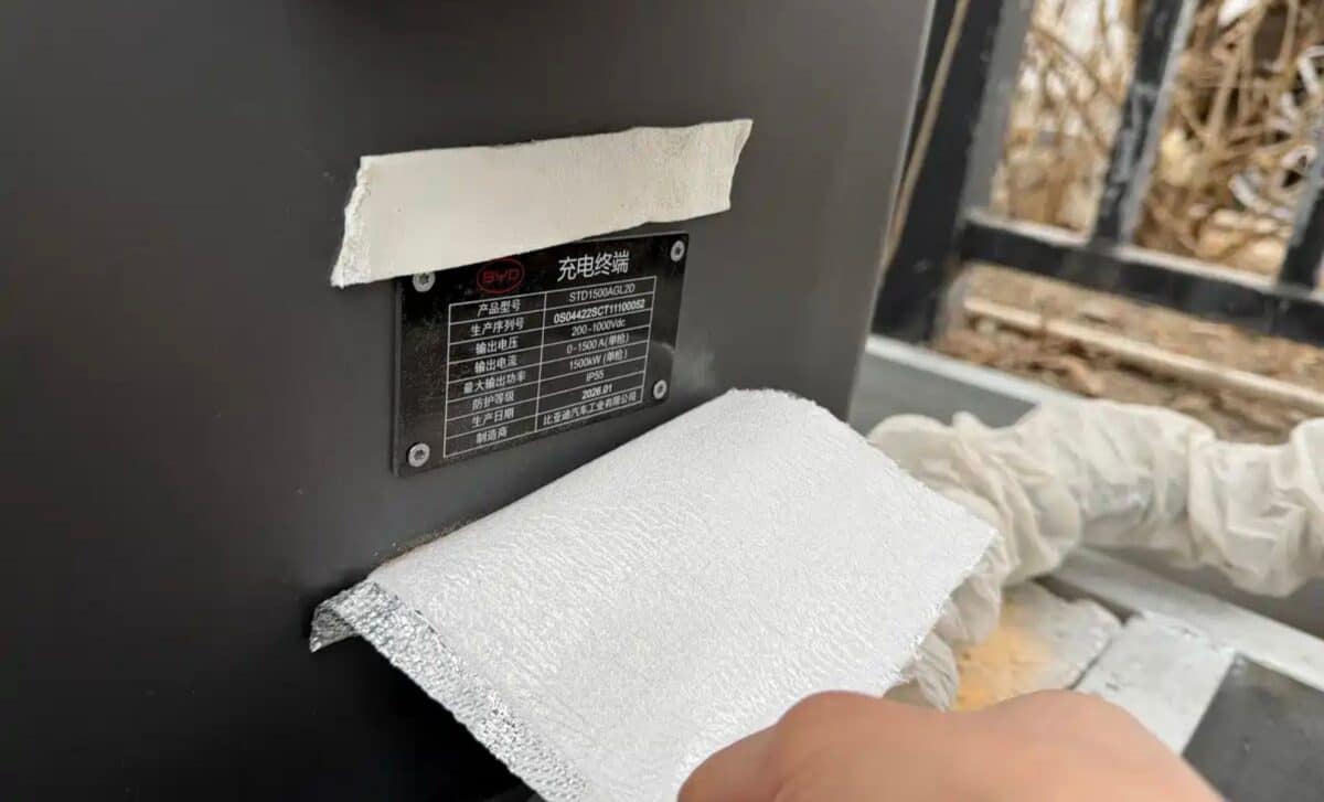 According to Electrek, the photographed charger carries a label indicating it was manufactured by BYD in January 2026. The specifications list 1000 volts and 1500 amps, resulting in a total capacity of 1,500kW when multiplied.