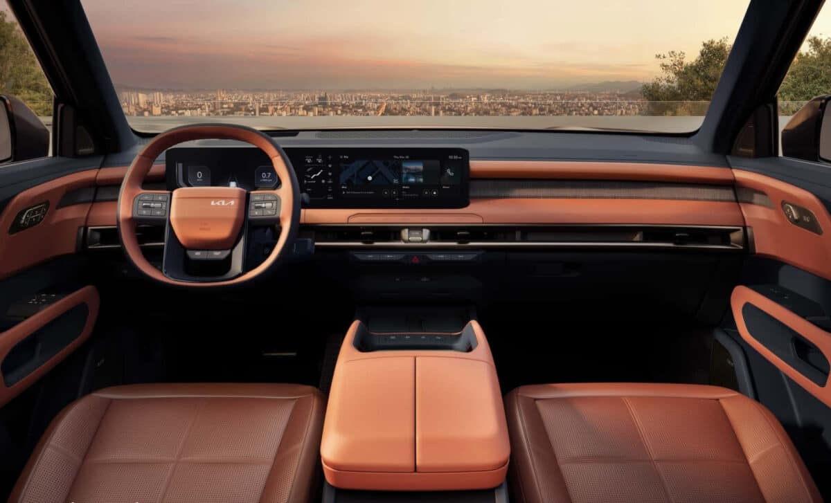 Kia also upgraded interior finishes across trim levels. Genuine wood and metal accents appear on the dashboard, door panels, and center console. Upper trims get two-tone leather seats with mesh-style headrests, and Kia is expanding the palette with interior colors like Deep Navy, Blackberry, Tuscan Umber, and Sand Beige.